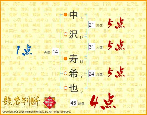 中沢寿希也さんの総運は45画の4点!