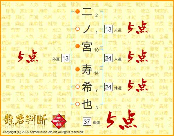 二(2画)ノ(1画)宮(10画) 寿(14画)希(7画)也(3画)