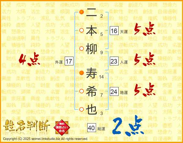 二(2画)本(5画)柳(9画) 寿(14画)希(7画)也(3画)