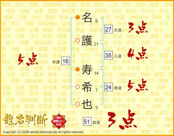 名(6画)護(21画) 寿(14画)希(7画)也(3画)