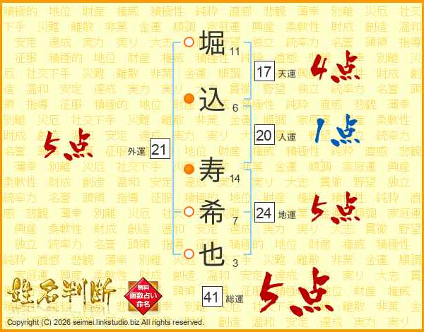 堀(11画)込(6画) 寿(14画)希(7画)也(3画)