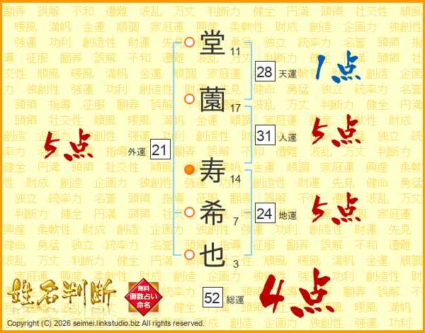堂(11画)薗(17画) 寿(14画)希(7画)也(3画)