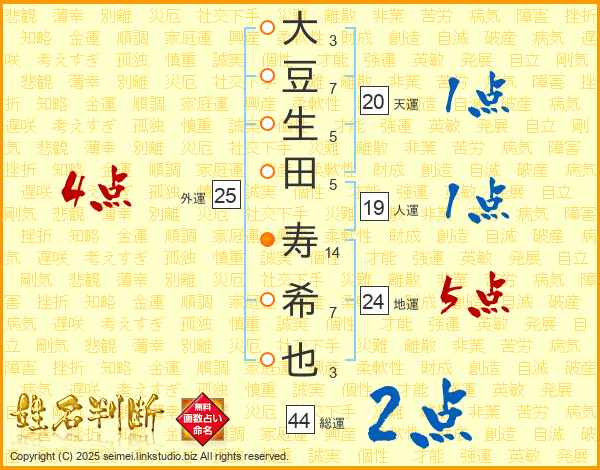 大(3画)豆(7画)生(5画)田(5画) 寿(14画)希(7画)也(3画)