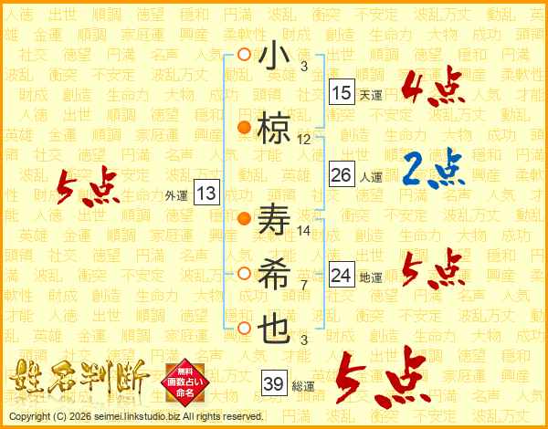 小椋寿希也さんの総運は39画の5点!