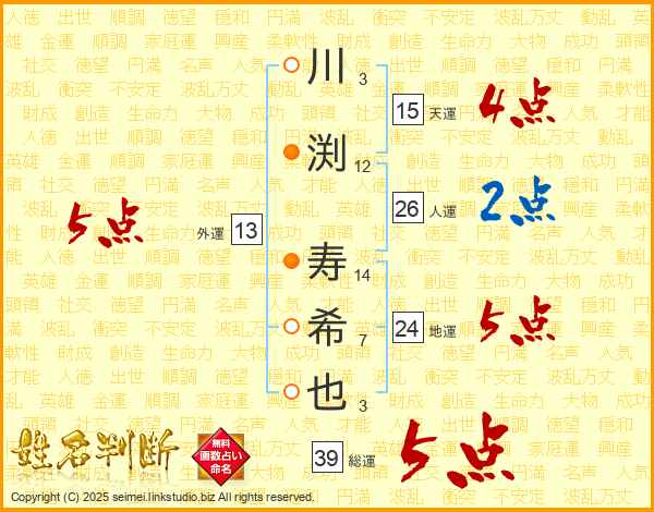 川(3画)渕(12画) 寿(14画)希(7画)也(3画)