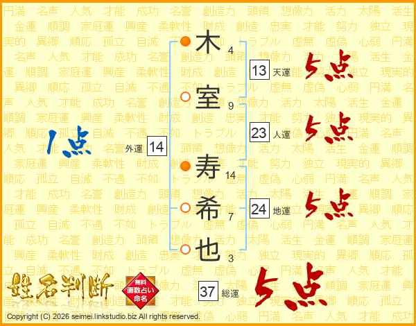 木室寿希也さんの総運は37画の5点!