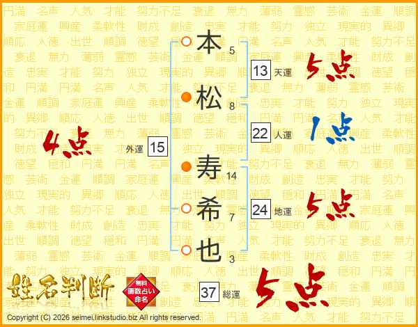 本松寿希也さんの総運は37画の5点!