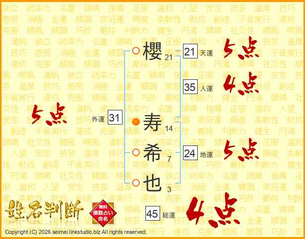 櫻(21画) 寿(14画)希(7画)也(3画)