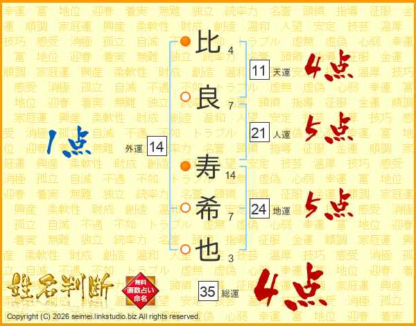 比(4画)良(7画) 寿(14画)希(7画)也(3画)
