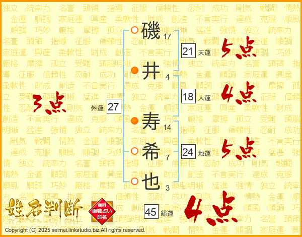 磯(17画)井(4画) 寿(14画)希(7画)也(3画)