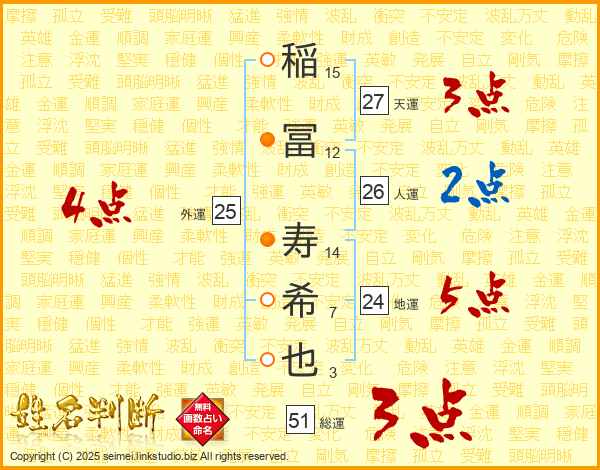 稲(15画)冨(12画) 寿(14画)希(7画)也(3画)