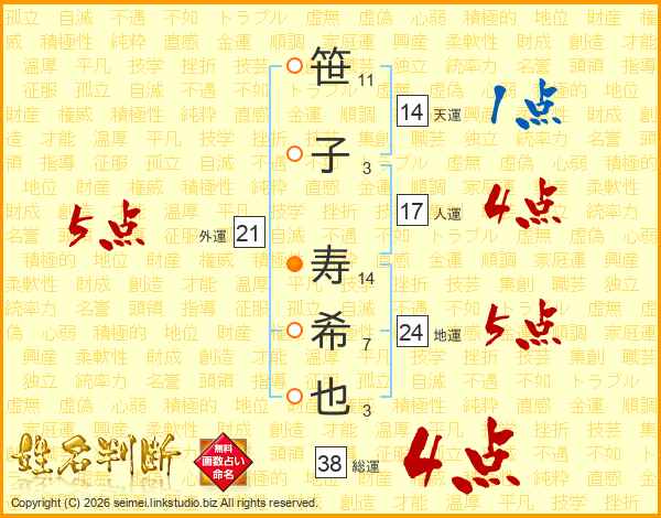 笹(11画)子(3画) 寿(14画)希(7画)也(3画)