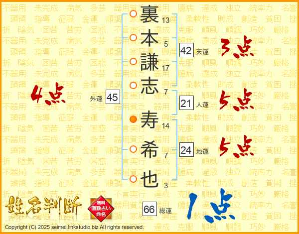 裏本謙志寿希也さんの総運は66画の1点!