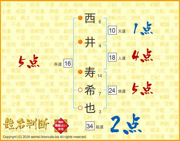 西井寿希也さんの総運は34画の2点!