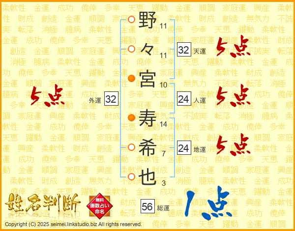 野(11画)々(11画)宮(10画) 寿(14画)希(7画)也(3画)