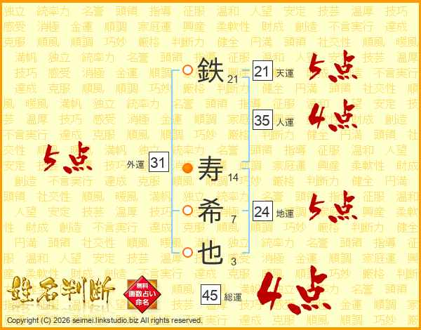鉄(21画) 寿(14画)希(7画)也(3画)
