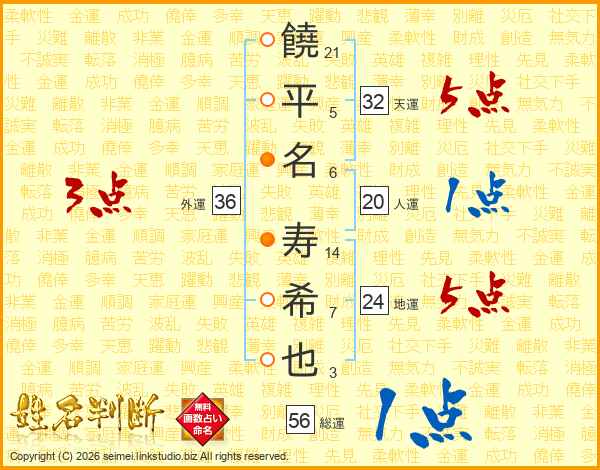 饒(21画)平(5画)名(6画) 寿(14画)希(7画)也(3画)
