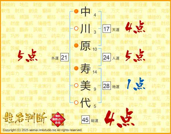 中(4画)川(3画)原(10画) 寿(14画)美(9画)代(5画)