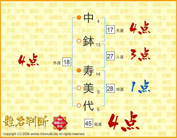 中(4画)鉢(13画) 寿(14画)美(9画)代(5画)
