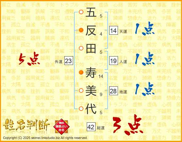 五(5画)反(4画)田(5画) 寿(14画)美(9画)代(5画)
