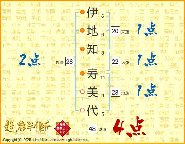 伊(6画)地(6画)知(8画) 寿(14画)美(9画)代(5画)
