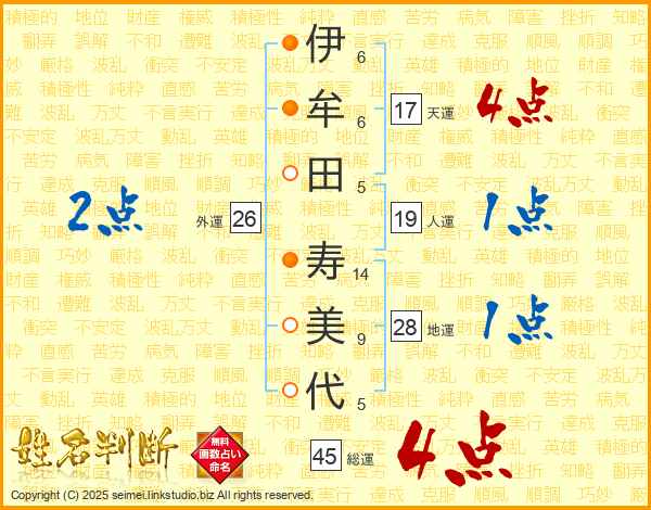 伊(6画)牟(6画)田(5画) 寿(14画)美(9画)代(5画)