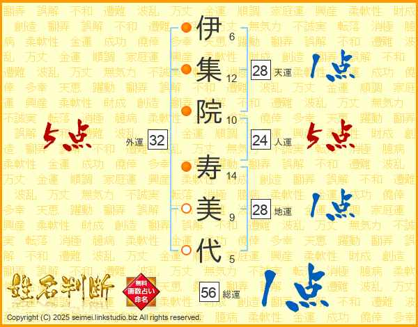 伊(6画)集(12画)院(10画) 寿(14画)美(9画)代(5画)