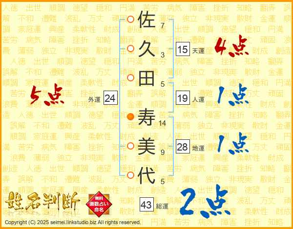 佐(7画)久(3画)田(5画) 寿(14画)美(9画)代(5画)