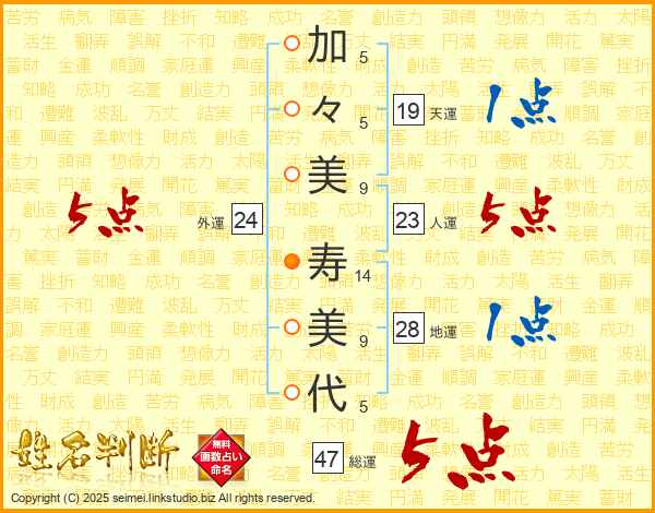 加(5画)々(5画)美(9画) 寿(14画)美(9画)代(5画)