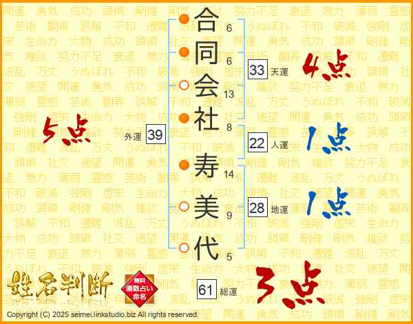 合(6画)同(6画)会(13画)社(8画) 寿(14画)美(9画)代(5画)
