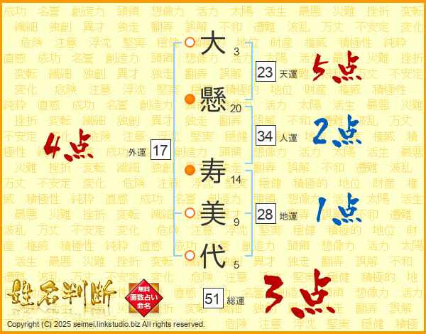 大(3画)懸(20画) 寿(14画)美(9画)代(5画)