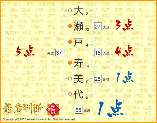 大(3画)瀬(20画)戸(4画) 寿(14画)美(9画)代(5画)
