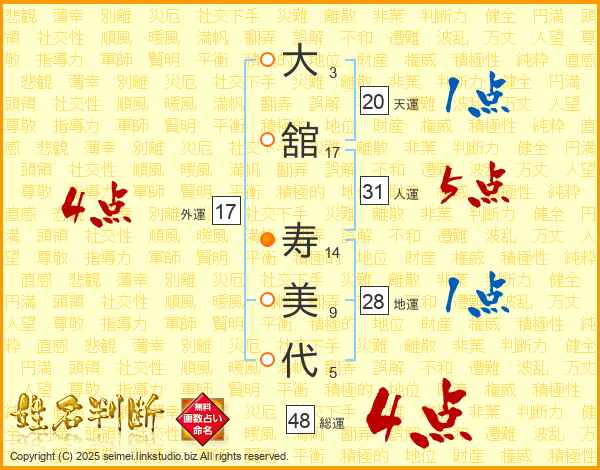 大(3画)舘(17画) 寿(14画)美(9画)代(5画)