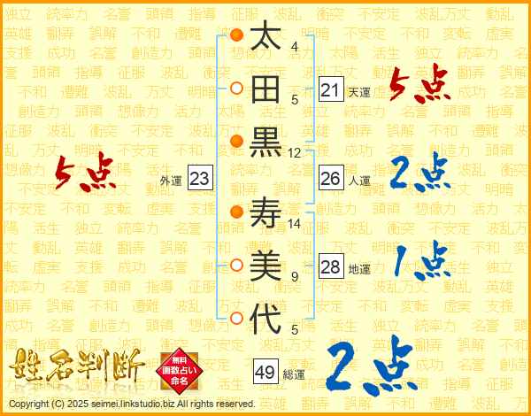 太(4画)田(5画)黒(12画) 寿(14画)美(9画)代(5画)