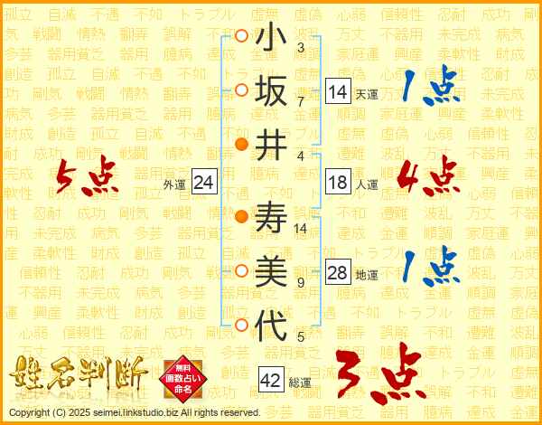 小(3画)坂(7画)井(4画) 寿(14画)美(9画)代(5画)