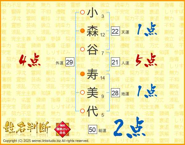 小(3画)森(12画)谷(7画) 寿(14画)美(9画)代(5画)