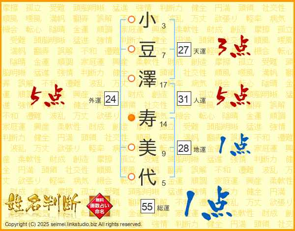 小(3画)豆(7画)澤(17画) 寿(14画)美(9画)代(5画)
