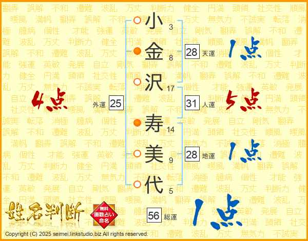 小(3画)金(8画)沢(17画) 寿(14画)美(9画)代(5画)