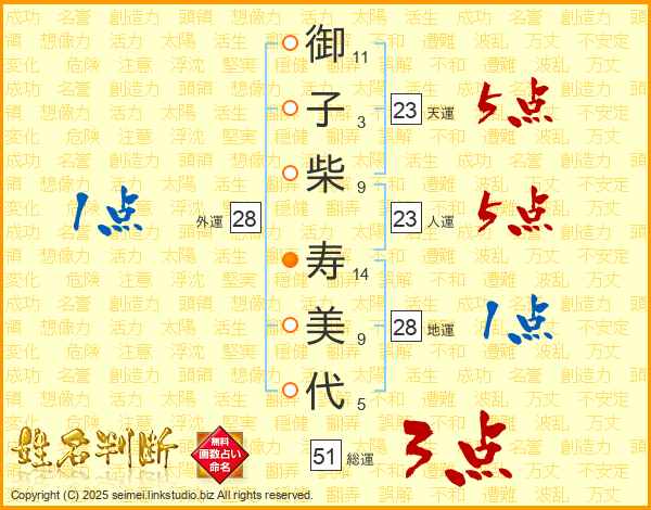 御(11画)子(3画)柴(9画) 寿(14画)美(9画)代(5画)
