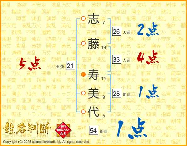 志(7画)藤(19画) 寿(14画)美(9画)代(5画)