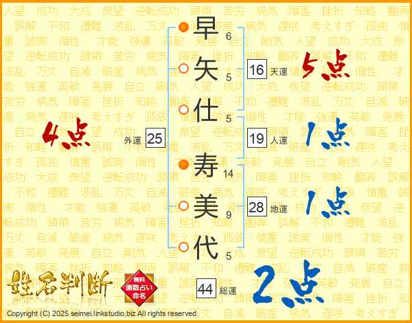 早(6画)矢(5画)仕(5画) 寿(14画)美(9画)代(5画)