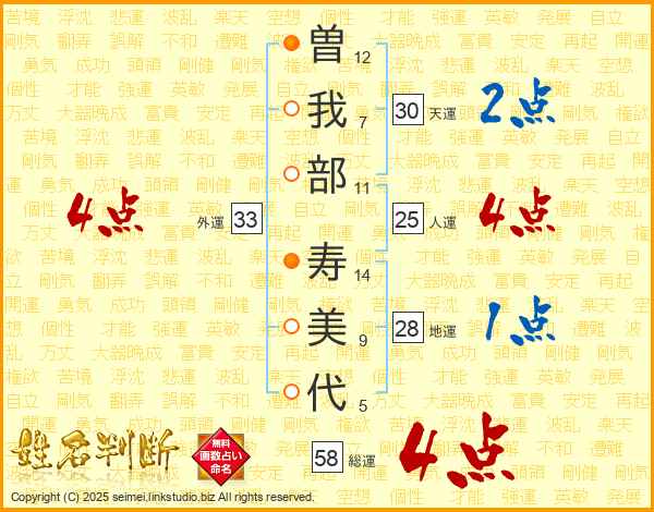 曽(12画)我(7画)部(11画) 寿(14画)美(9画)代(5画)