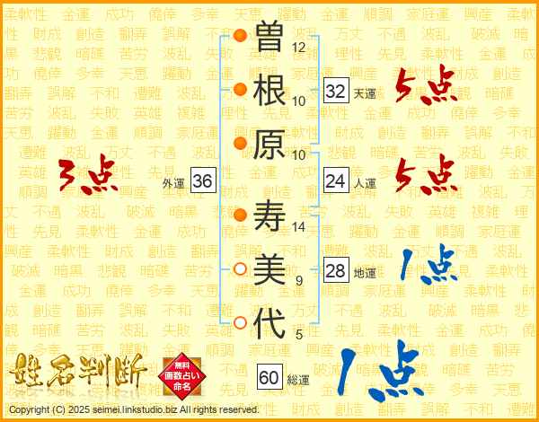 曽(12画)根(10画)原(10画) 寿(14画)美(9画)代(5画)