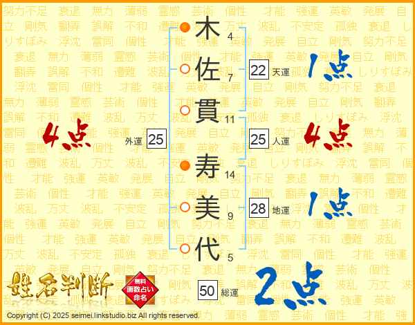 木(4画)佐(7画)貫(11画) 寿(14画)美(9画)代(5画)