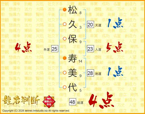 松(8画)久(3画)保(9画) 寿(14画)美(9画)代(5画)