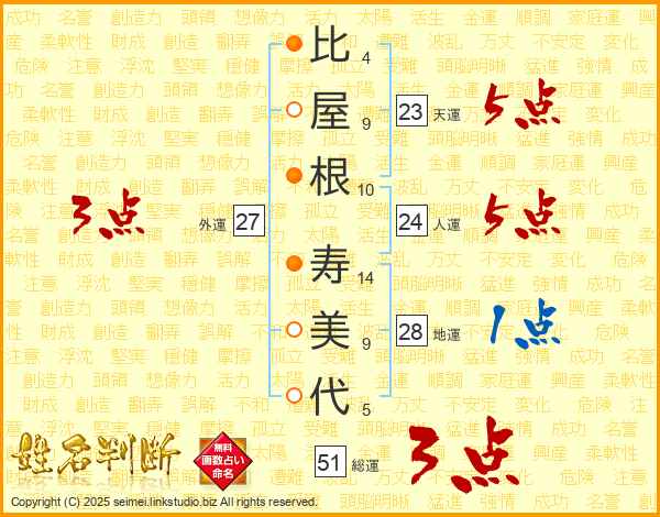比(4画)屋(9画)根(10画) 寿(14画)美(9画)代(5画)