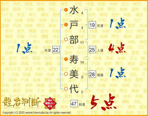 水(4画)戸(4画)部(11画) 寿(14画)美(9画)代(5画)