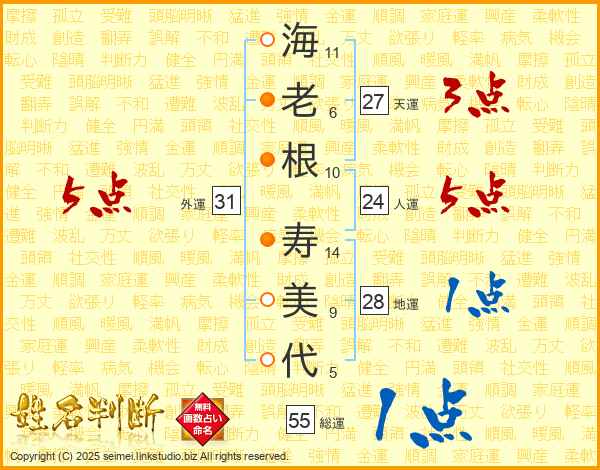 海(11画)老(6画)根(10画) 寿(14画)美(9画)代(5画)