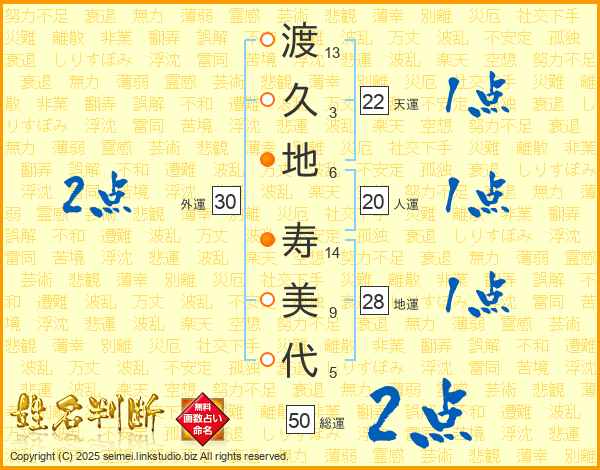 渡(13画)久(3画)地(6画) 寿(14画)美(9画)代(5画)