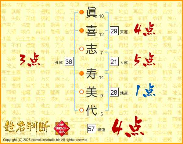 眞(10画)喜(12画)志(7画) 寿(14画)美(9画)代(5画)